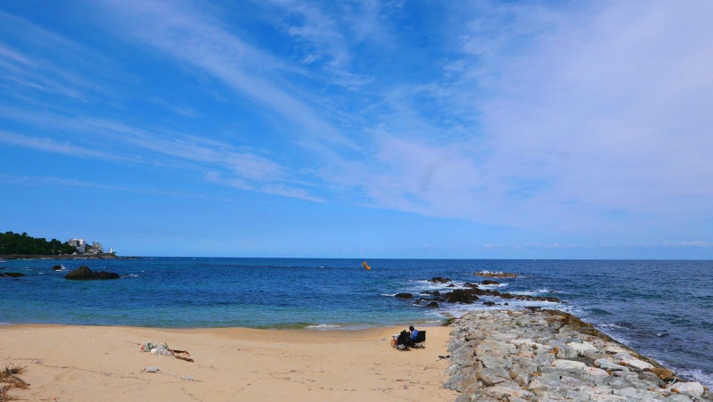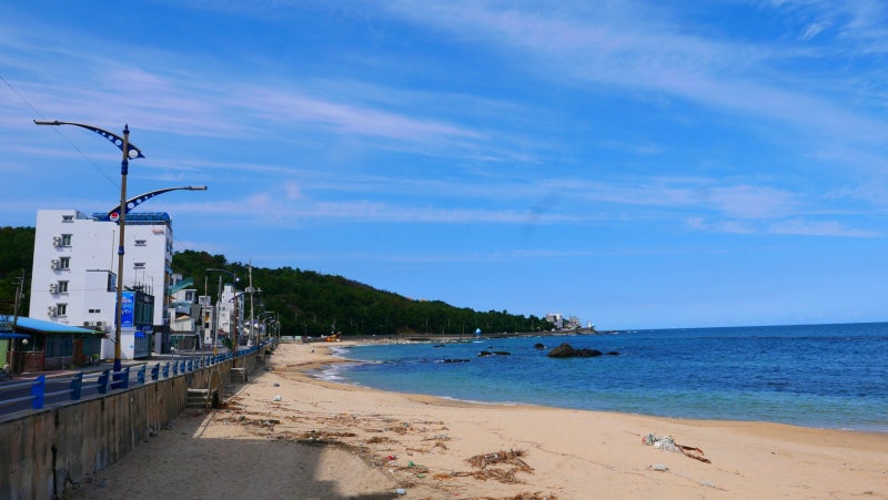 오달해변 주변의 이 해도 동해 여행지 오달해변 모래사장의 길이는 약 330m이며 해변 옆에 주차장이 있고 도로변에도 주차라인이 길게 그려져 있습니다.