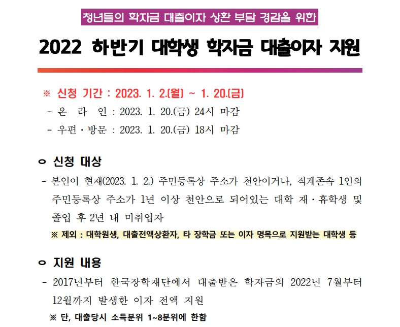 청년들의 학자금 대출이자 상환 부담 경감을 위한 천안시 2022 하반기 대학생 학자금 대출이자 지원 안내