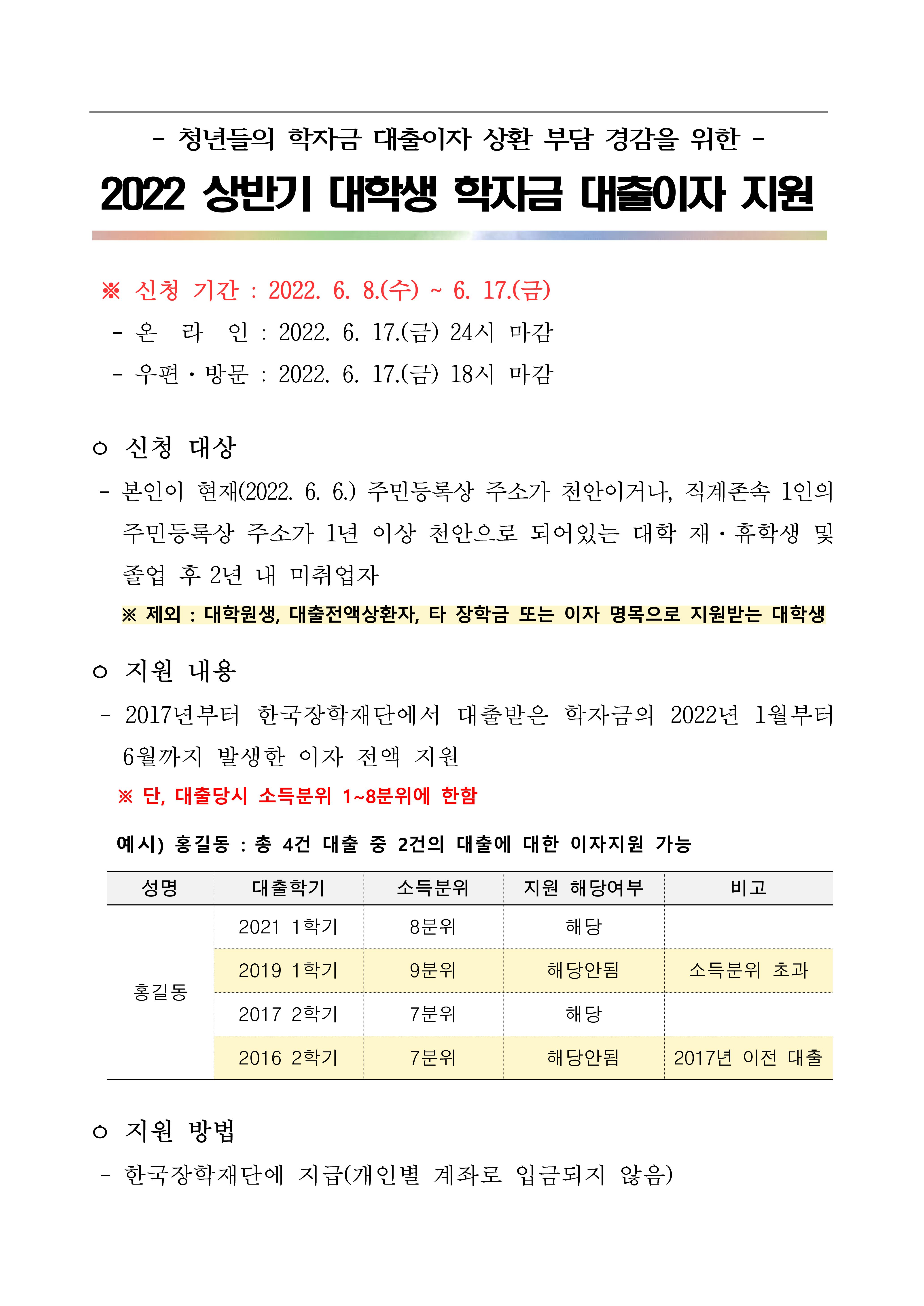 – 2017년부터 한국장학재단에서 대출받은 학자금 2022년 7월부터 12월까지 발생한 이자 전액 지원 ※단, 대출 당시 소득분위 1~8분위에 한한 예 : 홍길동 총 4건 대출 중 2건 대출에 대한 이자 지원 가능