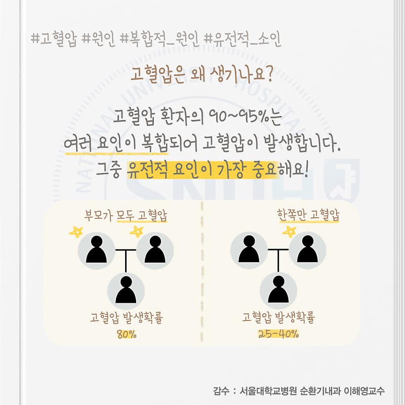 고혈압의 원인의 경우 질병의 원인에 의해 발생한 1차성 고혈압과 일상생활에서 반복되는 나쁜 습관과 관련하여 발생하는 2차성 고혈압으로 구분하여 볼 수 있습니다 이차성 고혈압의 원인으로는 유전은 물론 음식을 과도하게 섭취하거나 나트륨, 포화지방 섭취량이 많은 경우, 스트레스를 많이 받거나 긴장으로 인한 불면증이 심한 경우, 운동을 하지 않는 생활로 인한 비만, 과체중 상태인 경우, 반복적인 음주와 흡연 등이 포함되는데 패스트푸드를 즐기는 젊은 층에서도 이러한 이유로 인해 이차성 고혈압이 발생하는 경우가 지속적으로 증가하고 있습니다